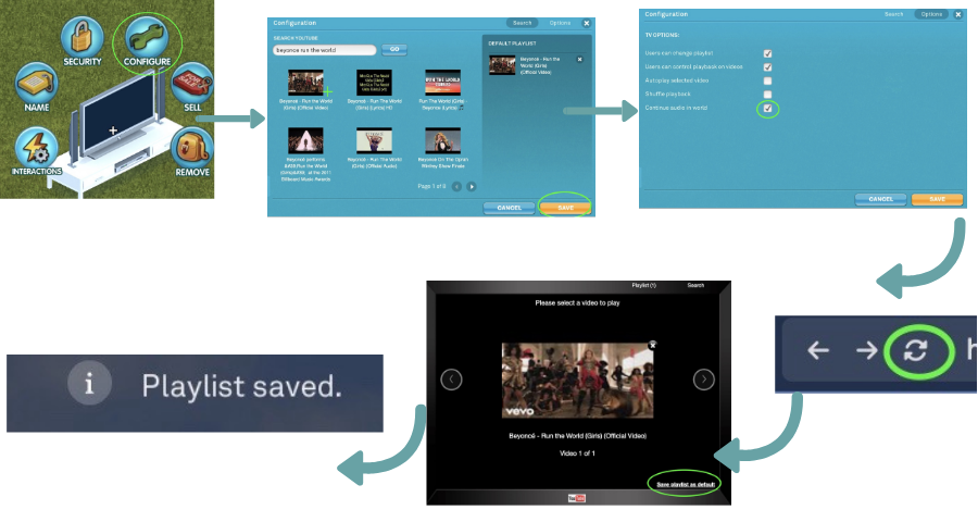 Youtube videos don't save and when I try to go to configure to select an auto play a song it doesn't let me save, as well as boombox and it's saying I have the remote and showing 3 of me in the avatar section